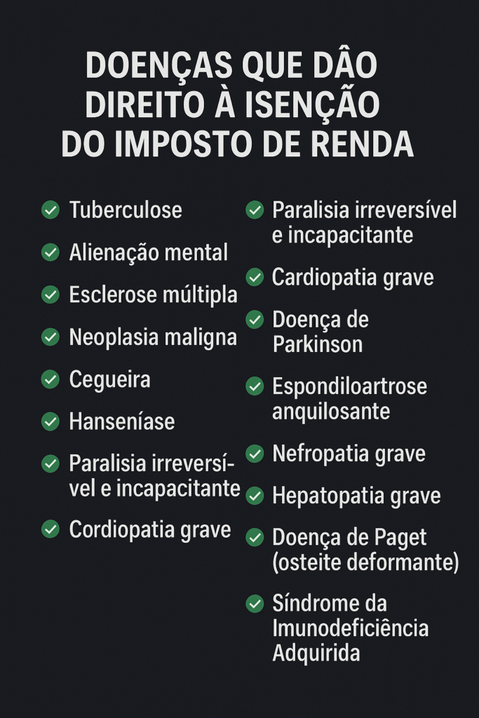 Segundo a lei, são 17 doenças que garantem a isenção do Imposto de Renda, porém existem variações que podem dar direito à isenção, verifique com um profissional especializado para saber se você se qualifica ao direito de isenção.